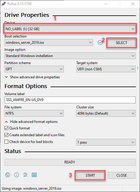 For å bruke dette programmet, velg enhet under Device (1). Deretter velg ISO fil ved å trykke på SELECT (2). Dette vil gi deg en filutforsker hvor du kan navigere til der ISO filen ligger. Når riktig ISO fil er markert, trykk på Open. Når alt er klart, trykk på START (3). Når installasjonen er ferdig, er det bare å koble fra USB-en og installere det du la på USB-en.