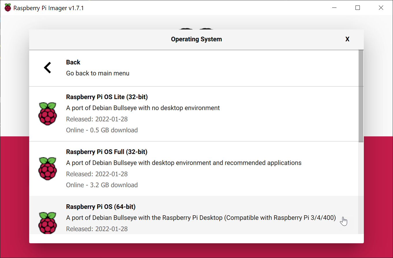 | CHOOSE OS | Raspberry PI OS (other) | Raspberry PI OS (64-bit) |