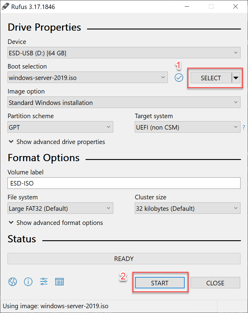 To use this, click select (1) This will give you a pop-up to select a file. After finding your ISO just click start. (2) This will give you a pop-up warning about erasing everything on the device. click OK and wait for it to finish. When done, click close and extract the USB.
