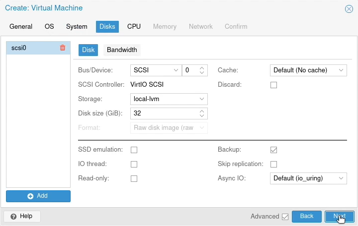 - Disk size Select the size of the disk in gigabytes. If your drive is partitioned with LVM-thin, you can safely provision more than you will use. This is because the VM will not be given more than what is actually used.
