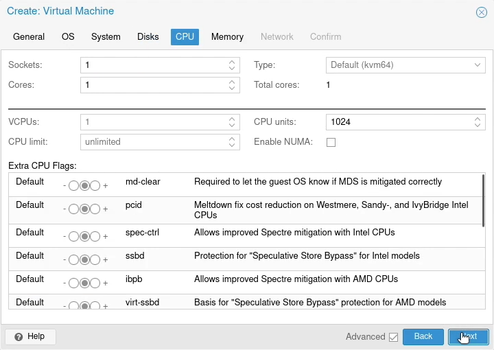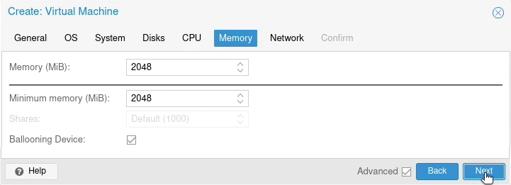 - Ballooning device When this is ticked, The VM will only be allocated the memory it actually uses at the moment. With this you will be able to overprovision the memory. But be careful, this can cause crashes and problems with VM's not starting.