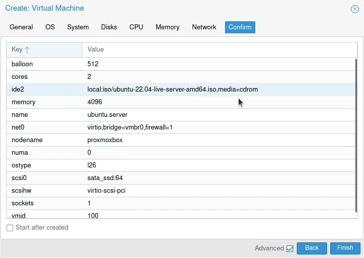 - Confirm. This is a summary screen to see over everything that has been set. You can also make it start after you click finish by ticking "Start after created".